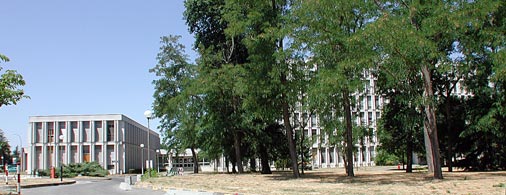 Le premier bâtiment, sorte de parallélépipède imposant de 9.300 m² abrite les services administratifs, deux amphithéâtres, des salles de cours et de travaux pratiques, les laboratoires de recherche et les bureaux d'études des enseignants chercheurs ainsi que des locaux dédiés à la vie étudiante.